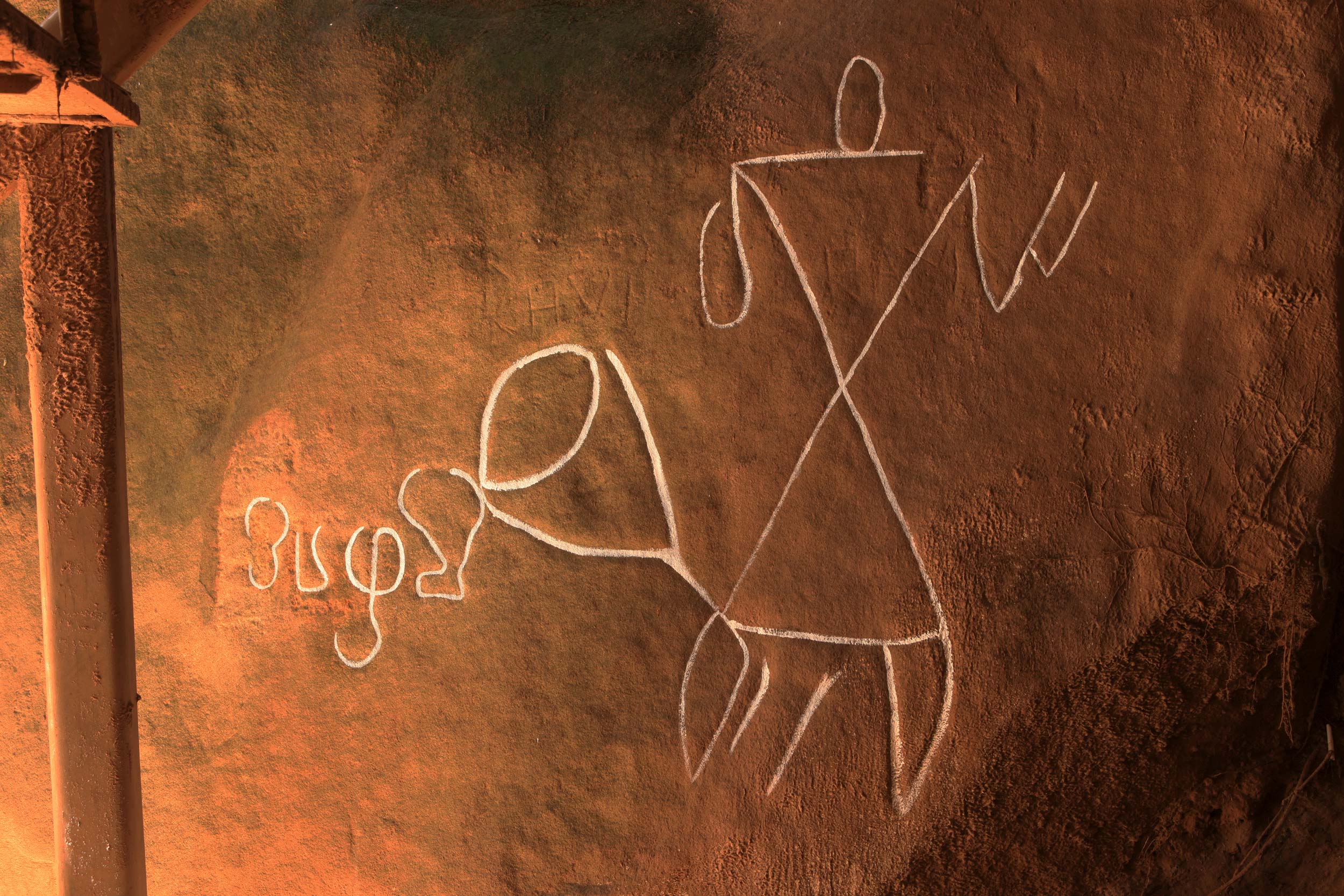 Edakal has two Tamil-Brāhmī inscriptions overlapping with the pre-historic carvings, both well above the eye level. Two more Tamil-Brāhmī inscriptions are known to have existed in this cave, also amidst the pre-historic carvings, at the time of the early surveys by Fawcett, of which only the estampages survive. The new discovery, the 5th Tamil-Brahmi inscription to be reported from here, is also on the northern wall of the cave, but a little away from the intensely carved region, at the bottom right as you descend into the cave. The discovery seems to have come to light at the time of clearing the earth to make way for rebuilding the staircase. This is the only label inscription in this corpus, appended as it seems, to an anthropomorphic figure that is probably of a later period, and different in style as well, compared to the other figures in the cave.