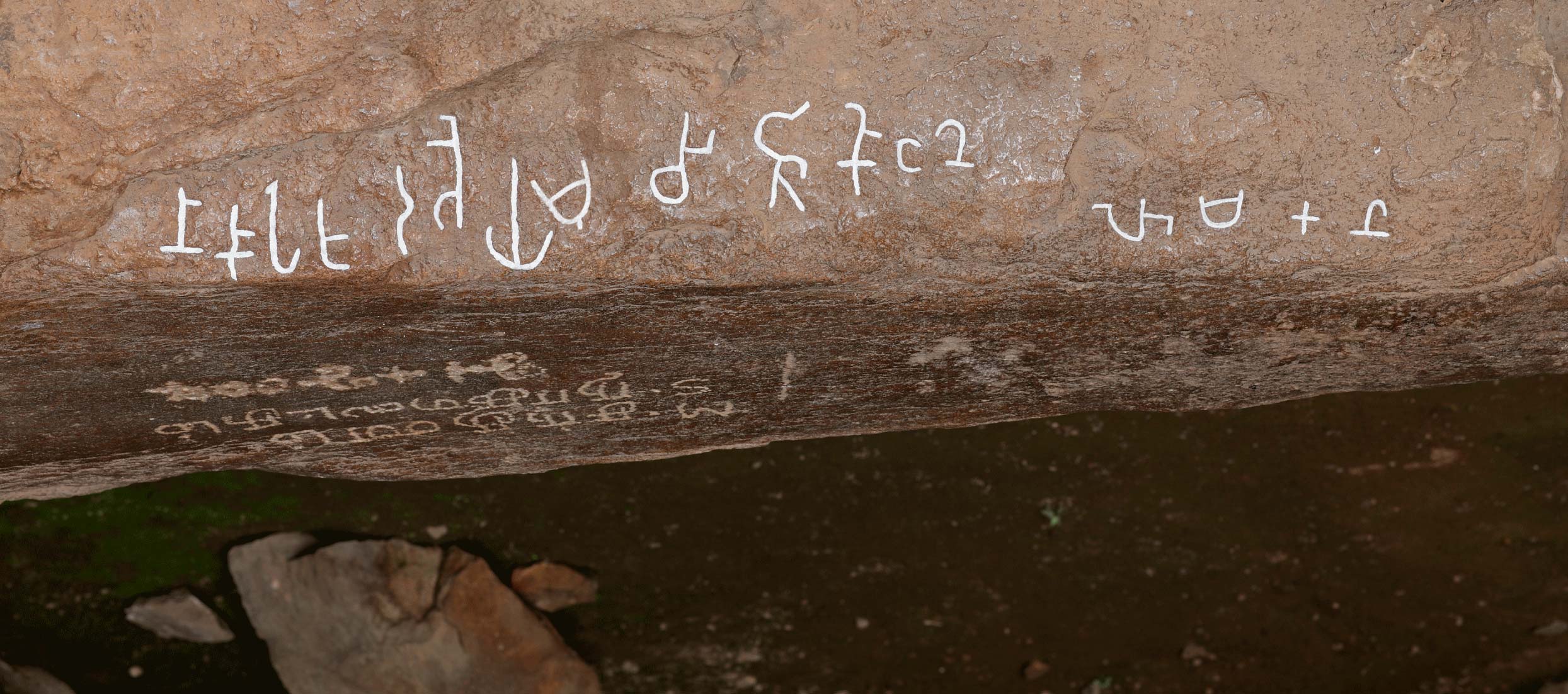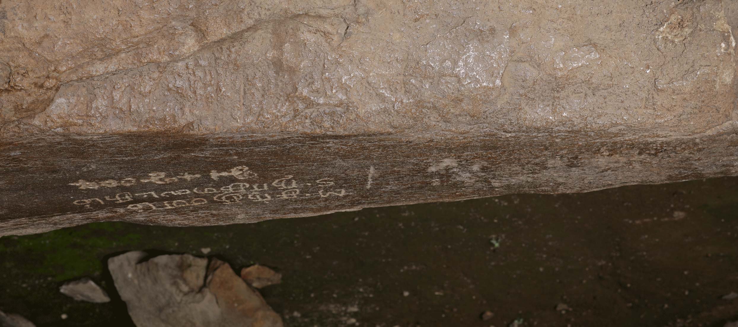 On the front side of an oblong boulder (the top of which is smoothened to serve as a bed) in the smaller cave on the Karaṭippaṭṭi hill. The inscription is engraved from right to left and upside down. It is reversed for direct reading. The inscription is engraved on a very rough and uneven surface and is difficult to make out. Click here to see inscription as in situ.